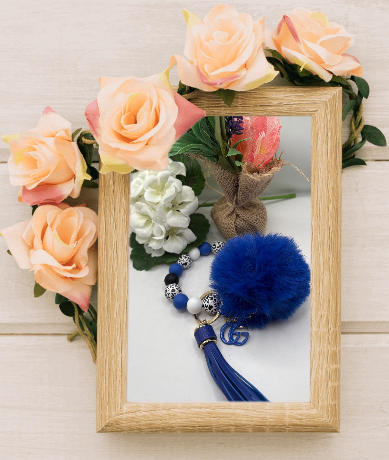 Beaded Royal Blue, Black, and White Keychain with Plush ball and Designer Inspired Charm.